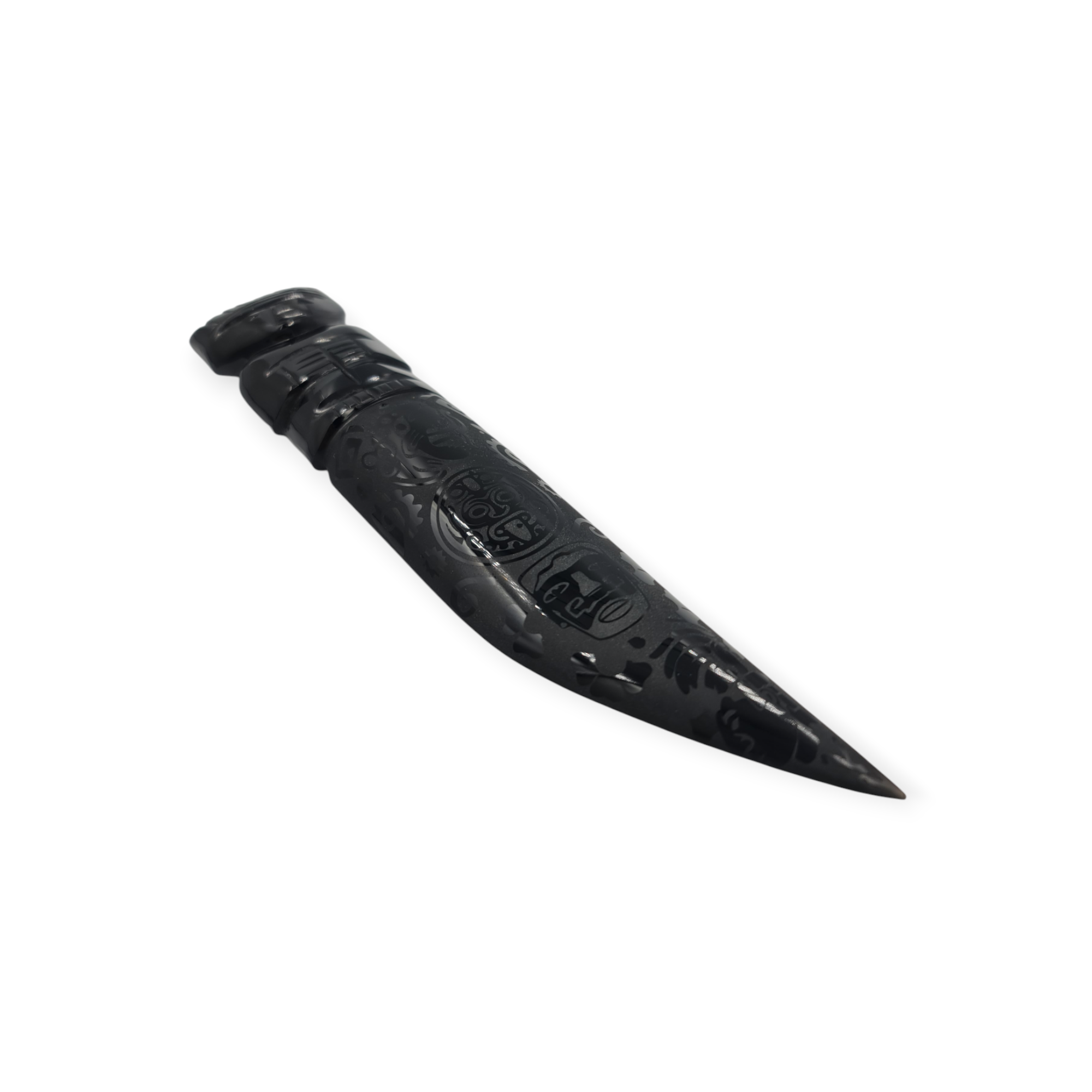Abrecartas elaborado en obsidiana negra natural, grabado con símbolos de inspiración prehispánica. Su diseño combina funcionalidad y carácter cultural, convirtiéndolo en una pieza distintiva para escritorio u oficina.