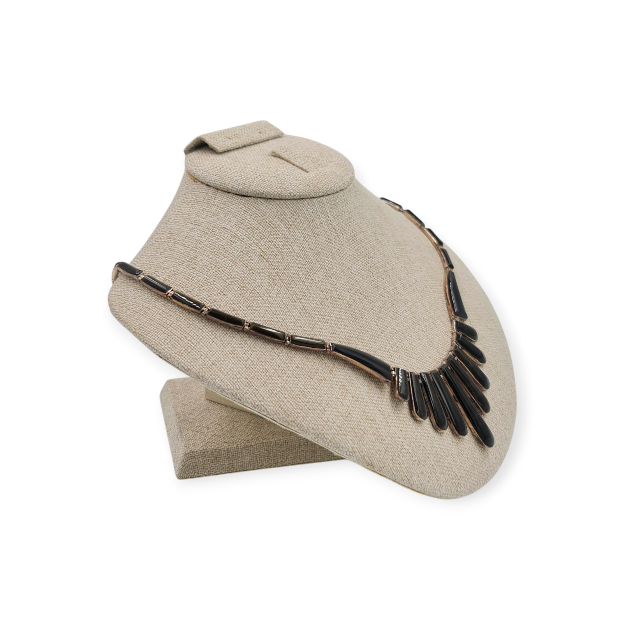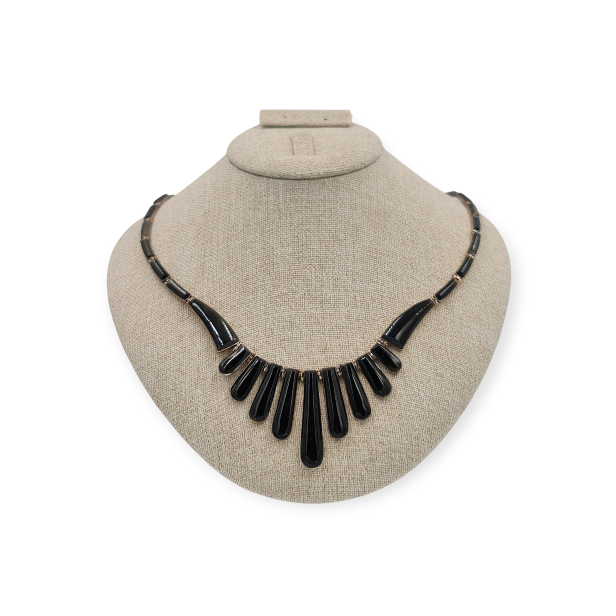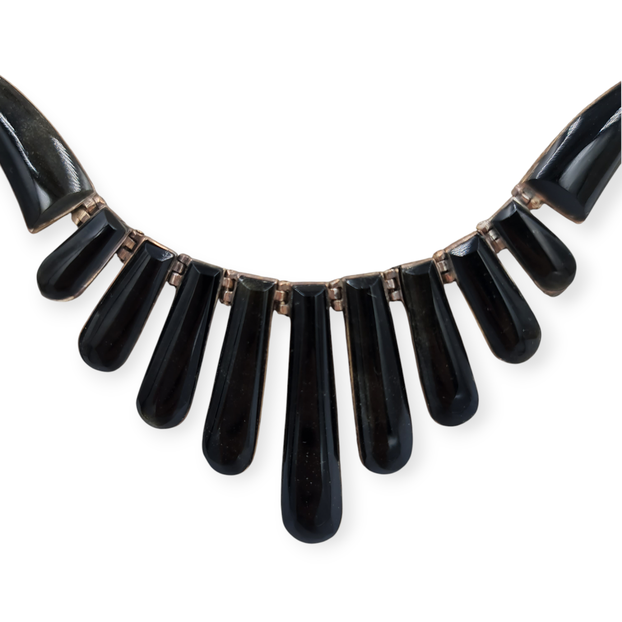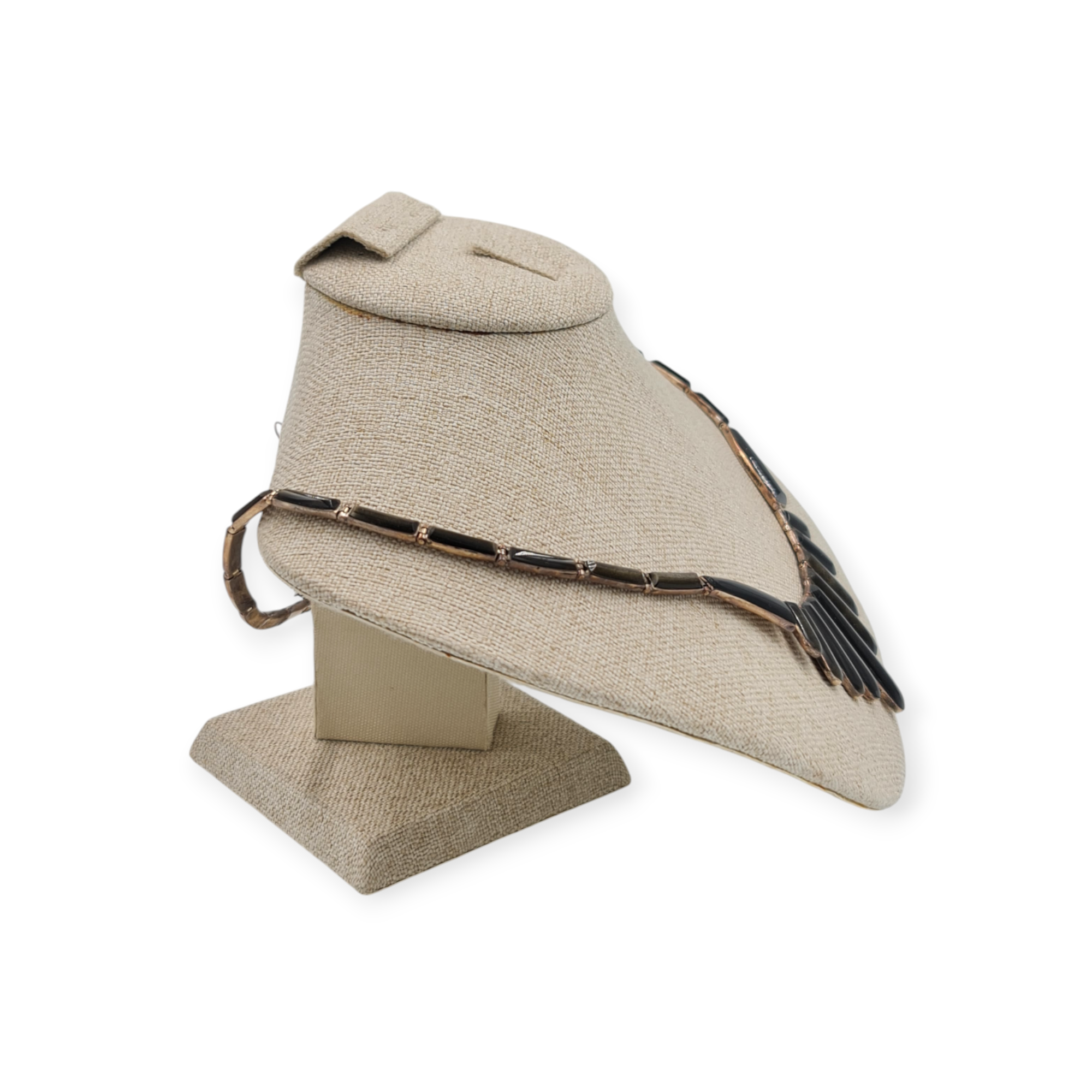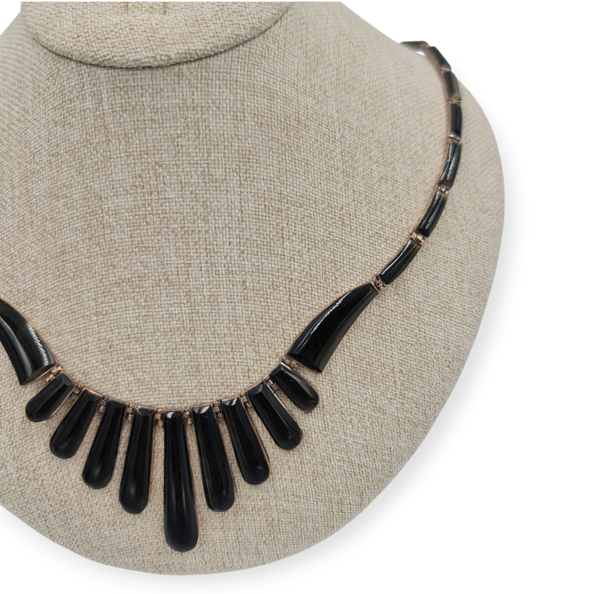 Esta pieza de joyería artesanal está elaborada en obsidiana natural, una piedra volcánica de gran importancia para la civilización teotihuacana, quienes la consideraban un material sagrado por su origen en el fuego de la tierra y su profundo significado espiritual.