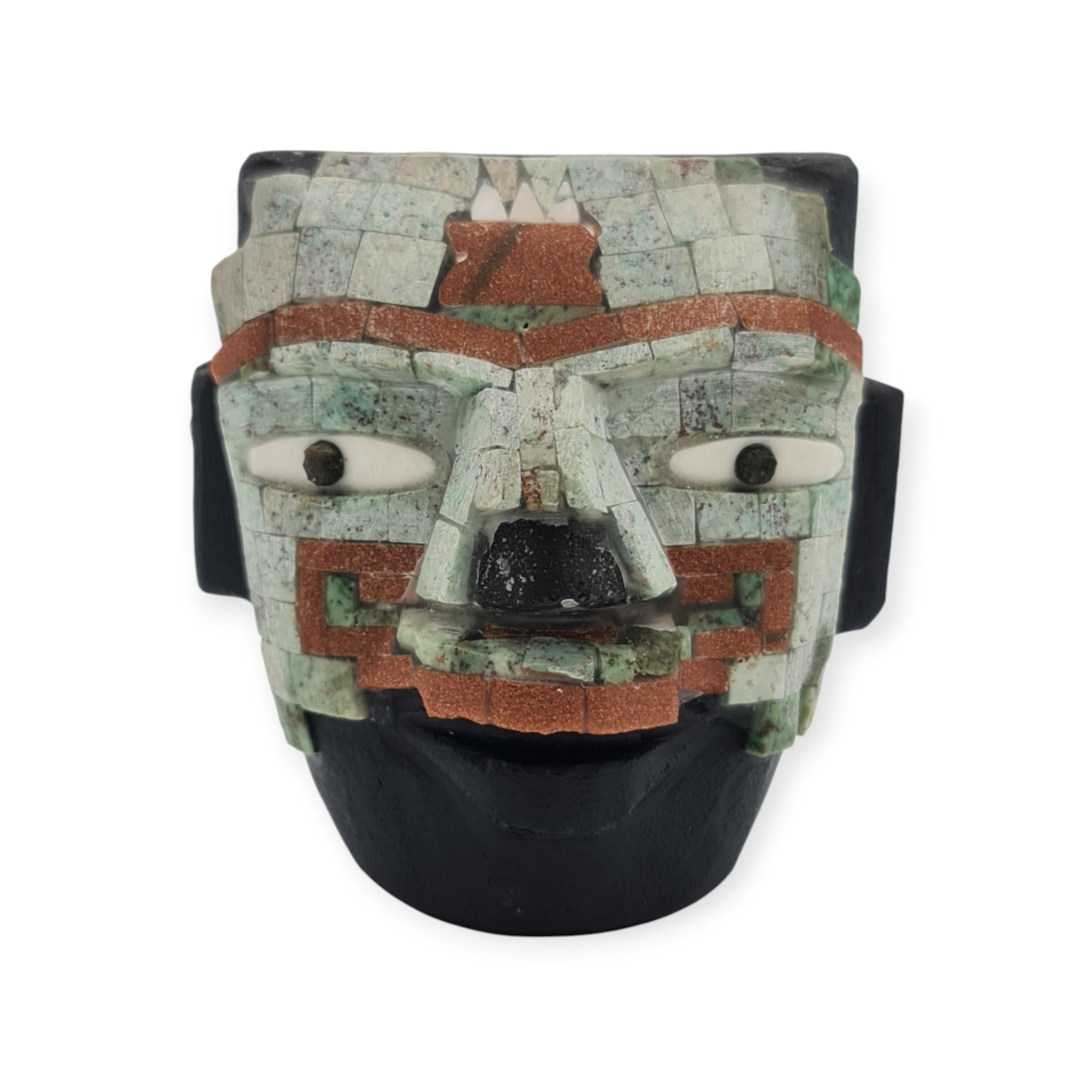 Esta pieza es una representación de una máscara ceremonial teotihuacana, elaborada a base de obsidiana negra con incrustaciones de piedras semipreciosas y un acabado rústico que conserva la fuerza natural del material. En la cultura teotihuacana, las máscaras tuvieron un papel central dentro de los rituales y ceremonias, funcionando como objetos de transformación simbólica y conexión con lo sagrado.