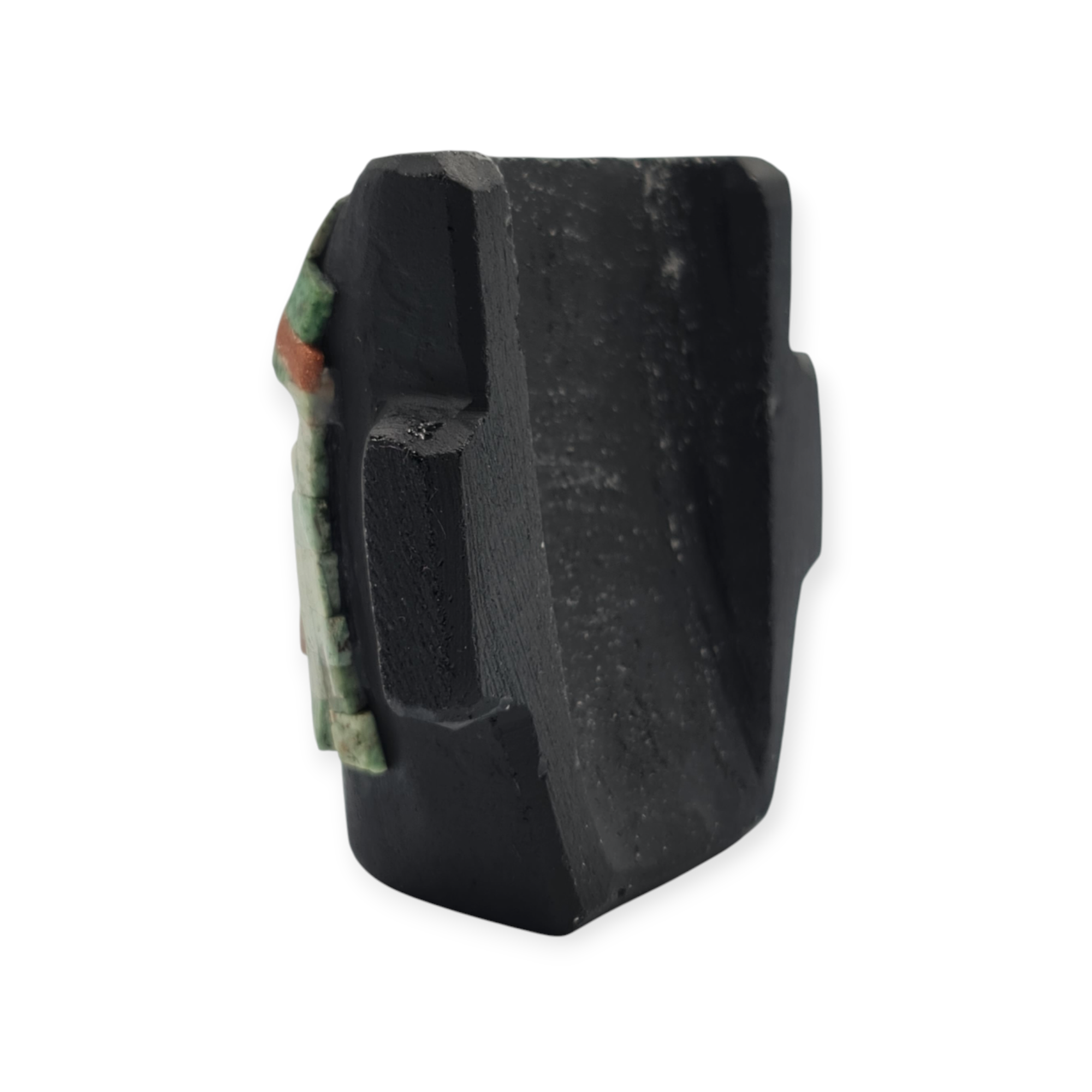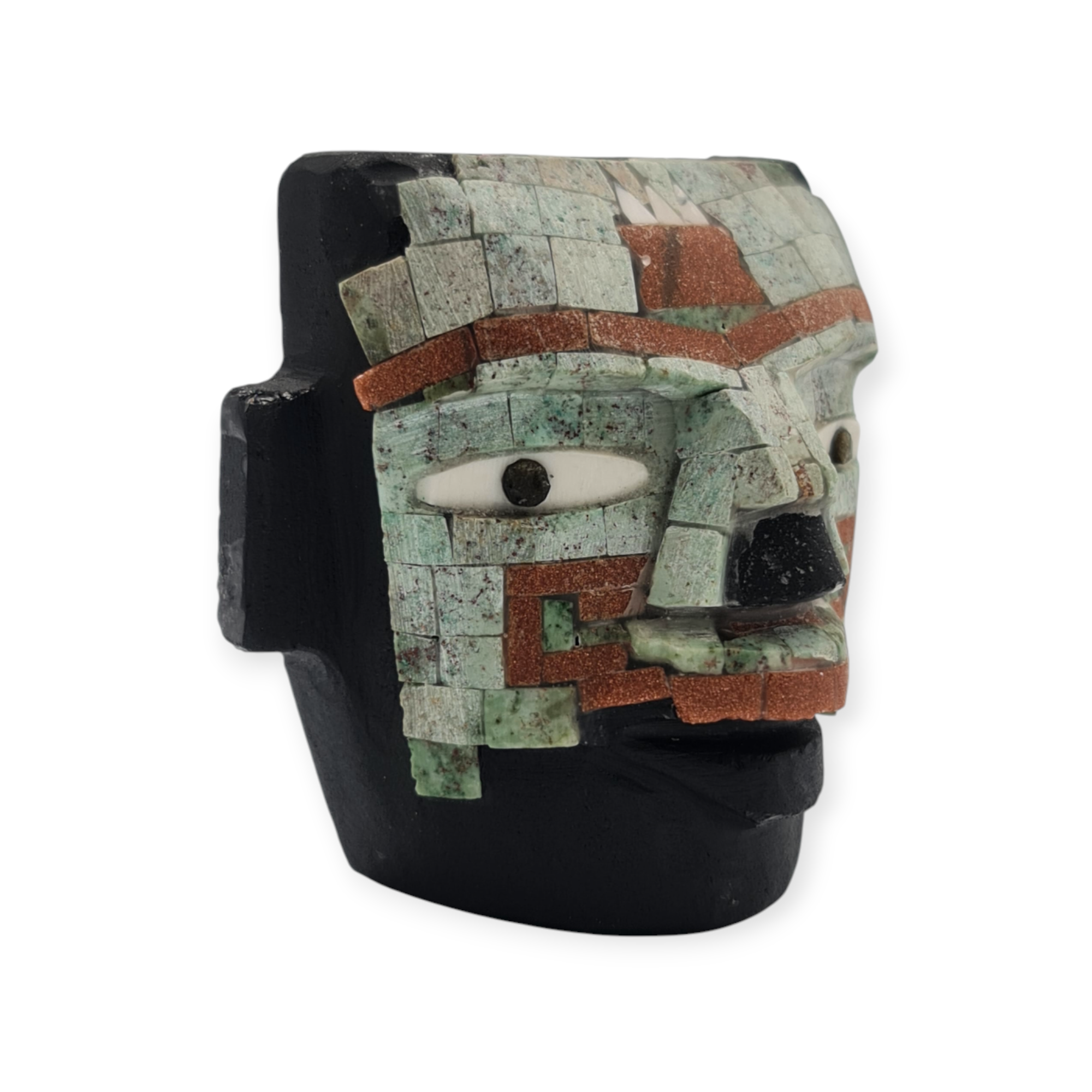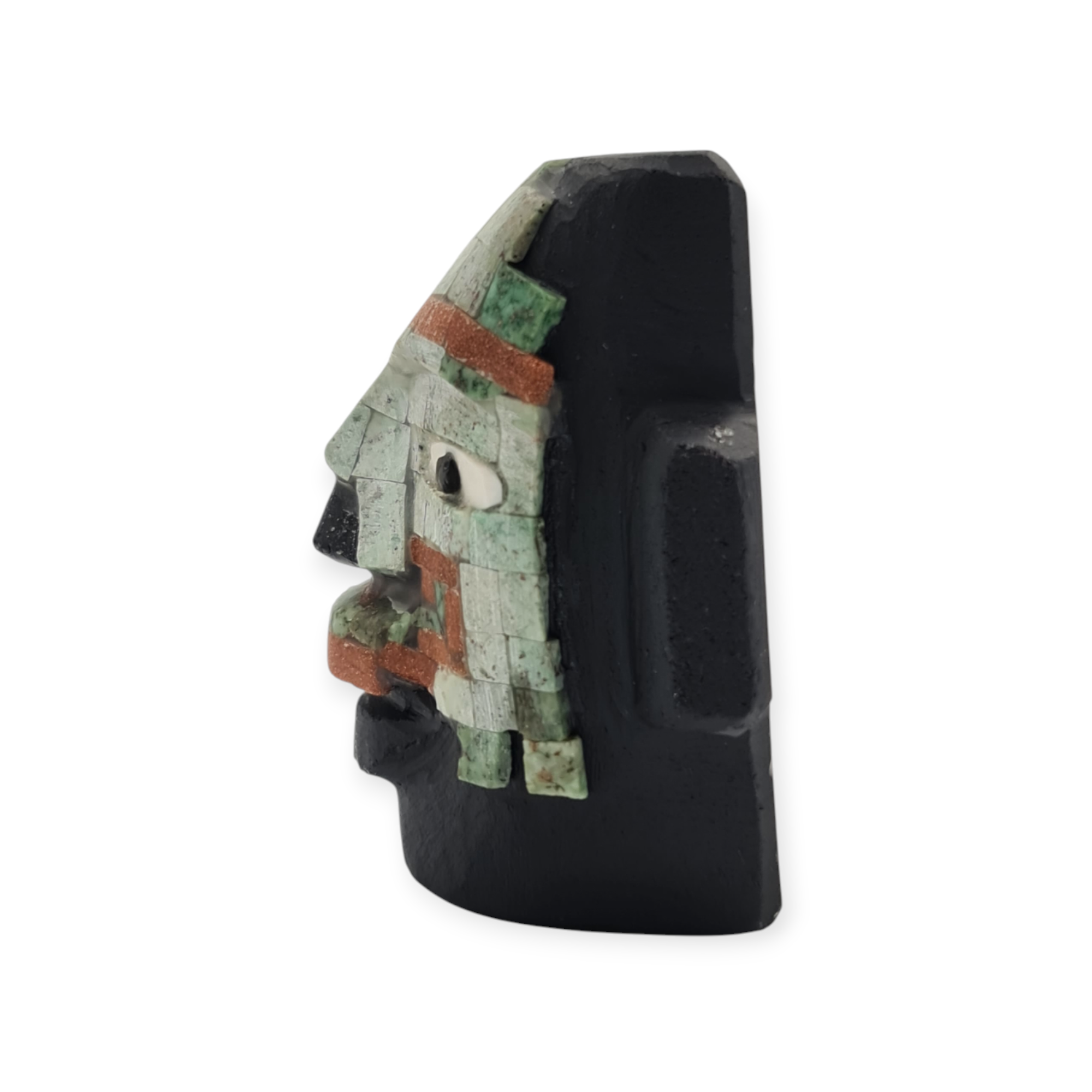 La obsidiana negra, material de gran relevancia en Teotihuacan, refuerza el carácter ceremonial de la pieza por su asociación con la profundidad, la introspección y el poder simbólico. Las piedras semipreciosas incrustadas aportan contraste y energía visual, resaltando la importancia ritual del objeto. El acabado rústico mantiene la pieza cercana a su origen material y simbólico.
