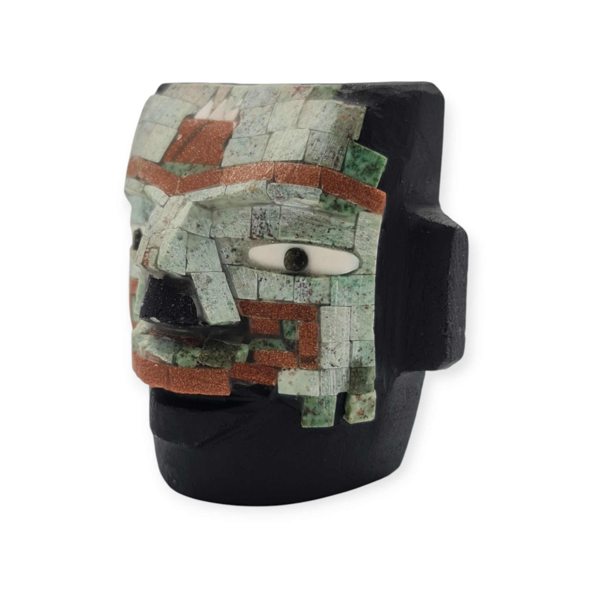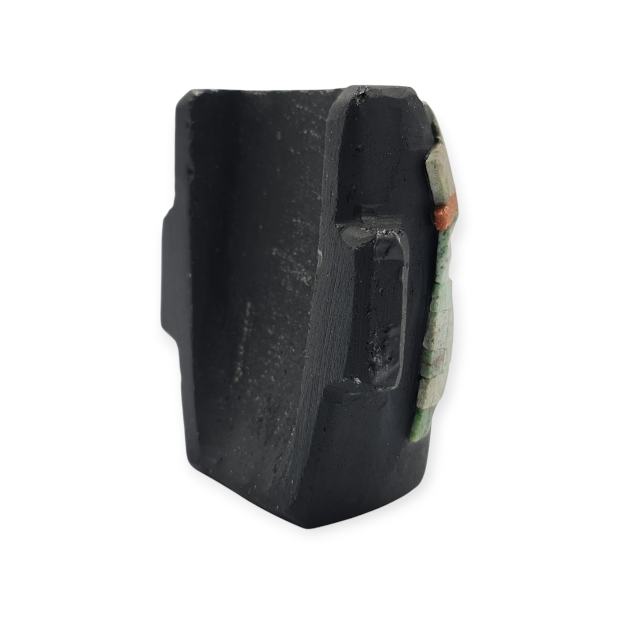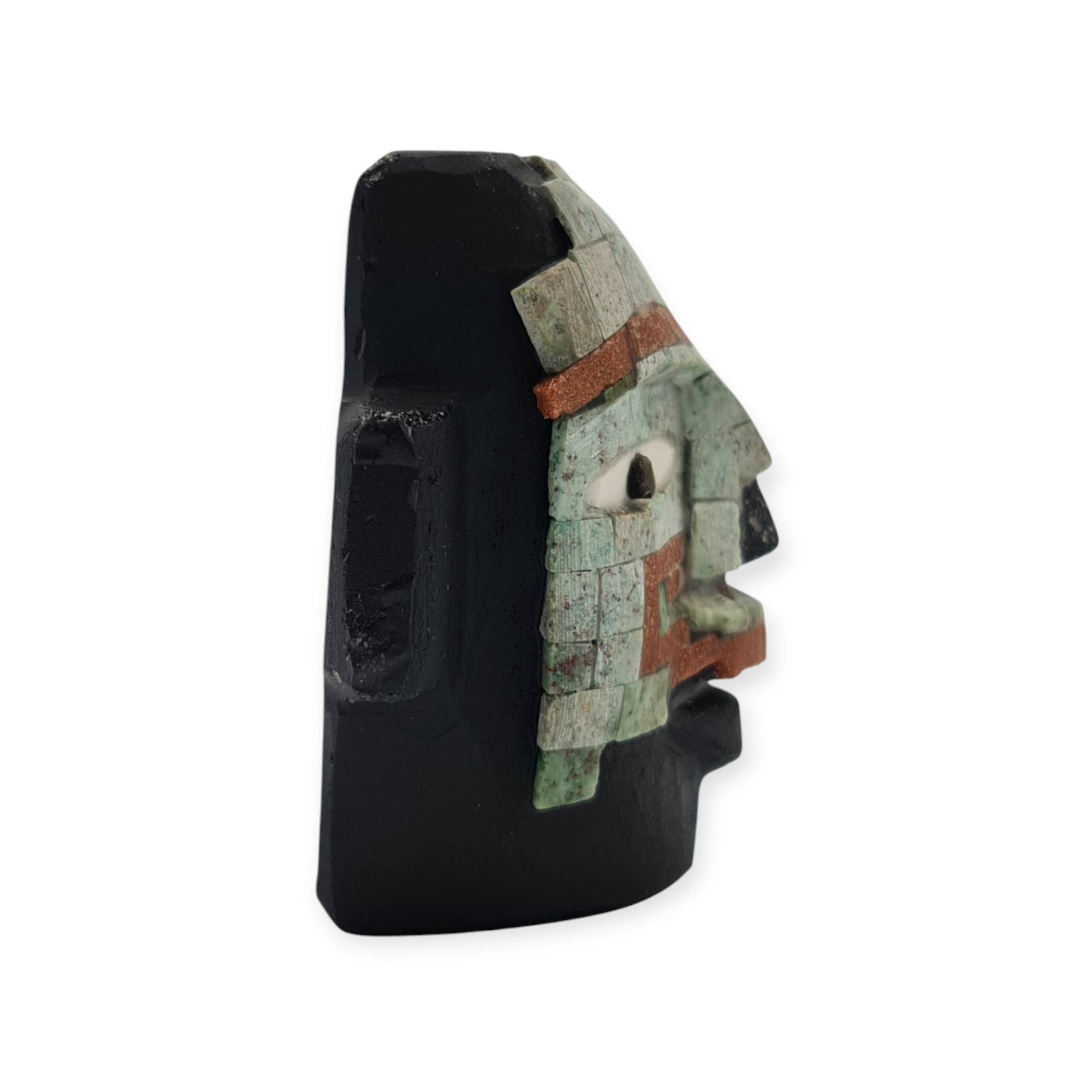 La obsidiana negra, material de gran relevancia en Teotihuacan, refuerza el carácter ceremonial de la pieza por su asociación con la profundidad, la introspección y el poder simbólico. Las piedras semipreciosas incrustadas aportan contraste y energía visual, resaltando la importancia ritual del objeto. El acabado rústico mantiene la pieza cercana a su origen material y simbólico.