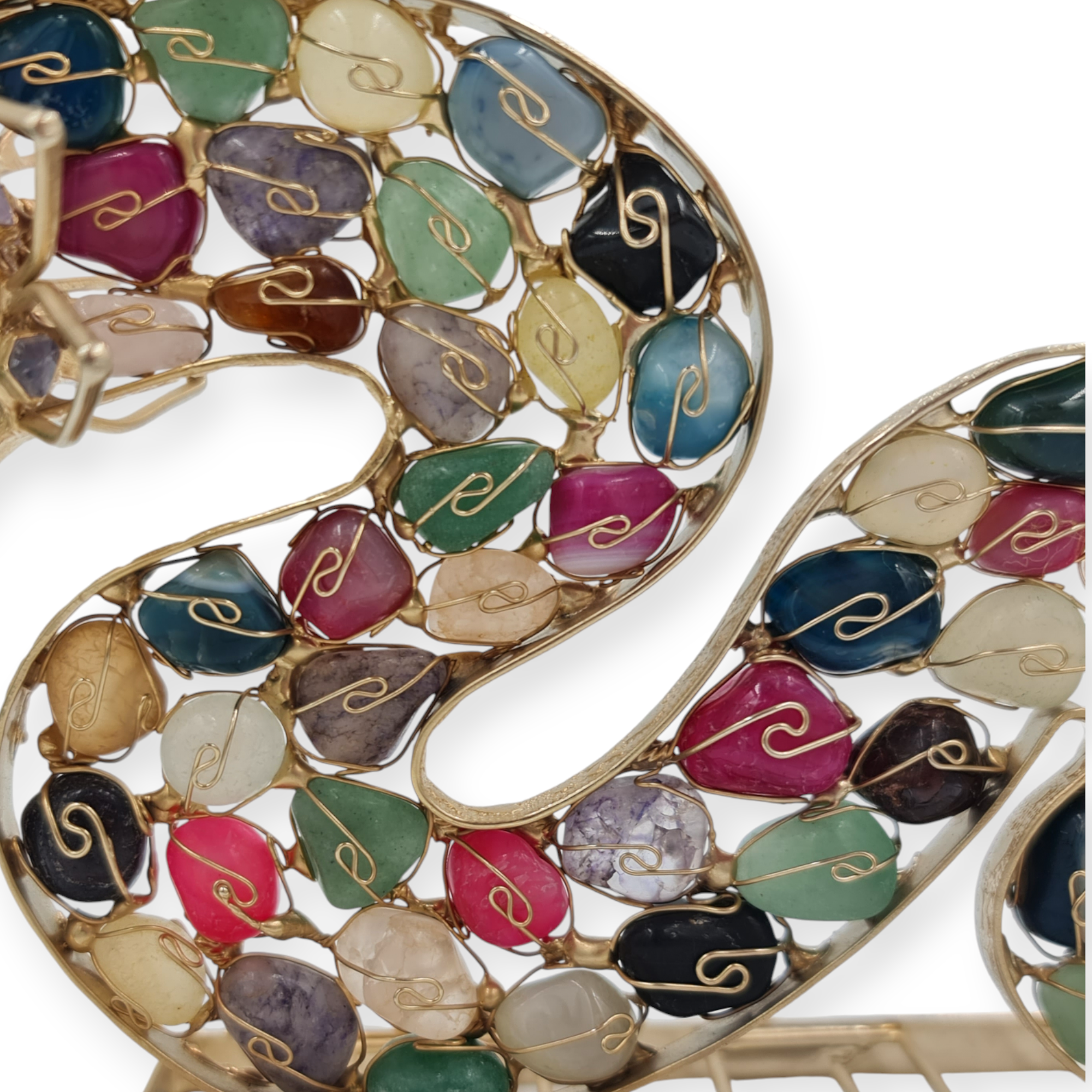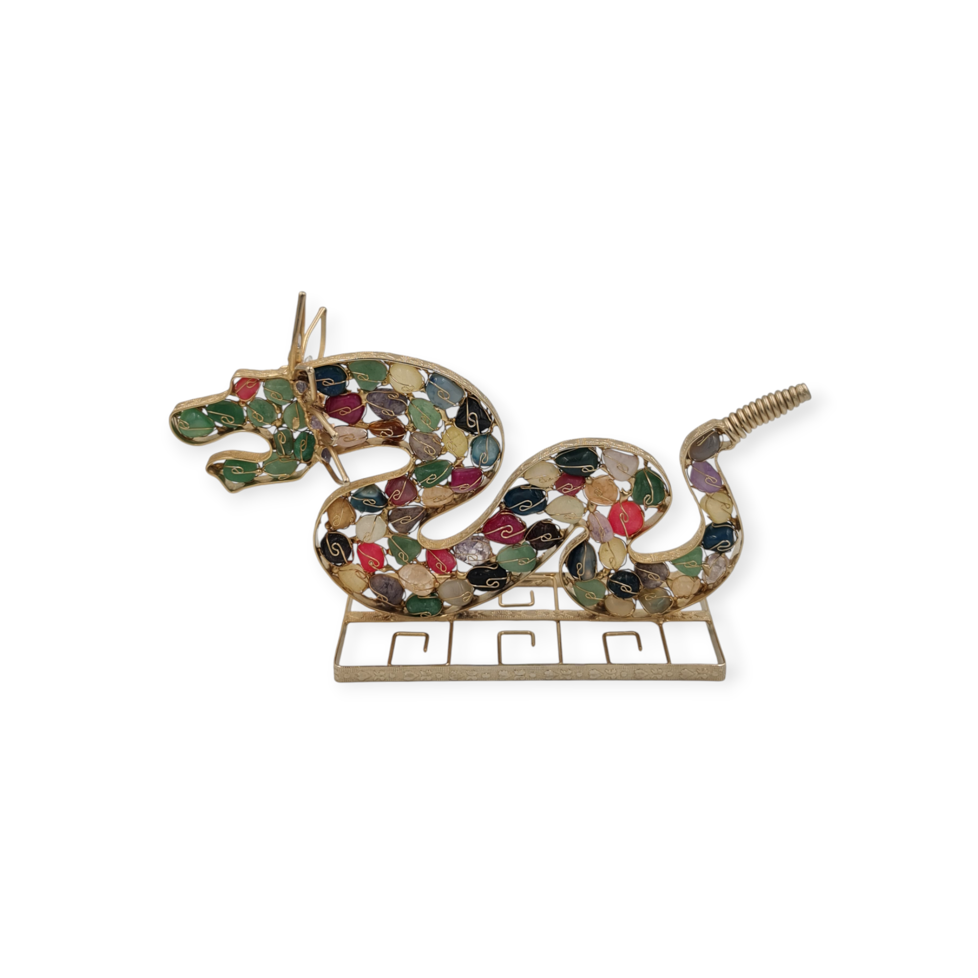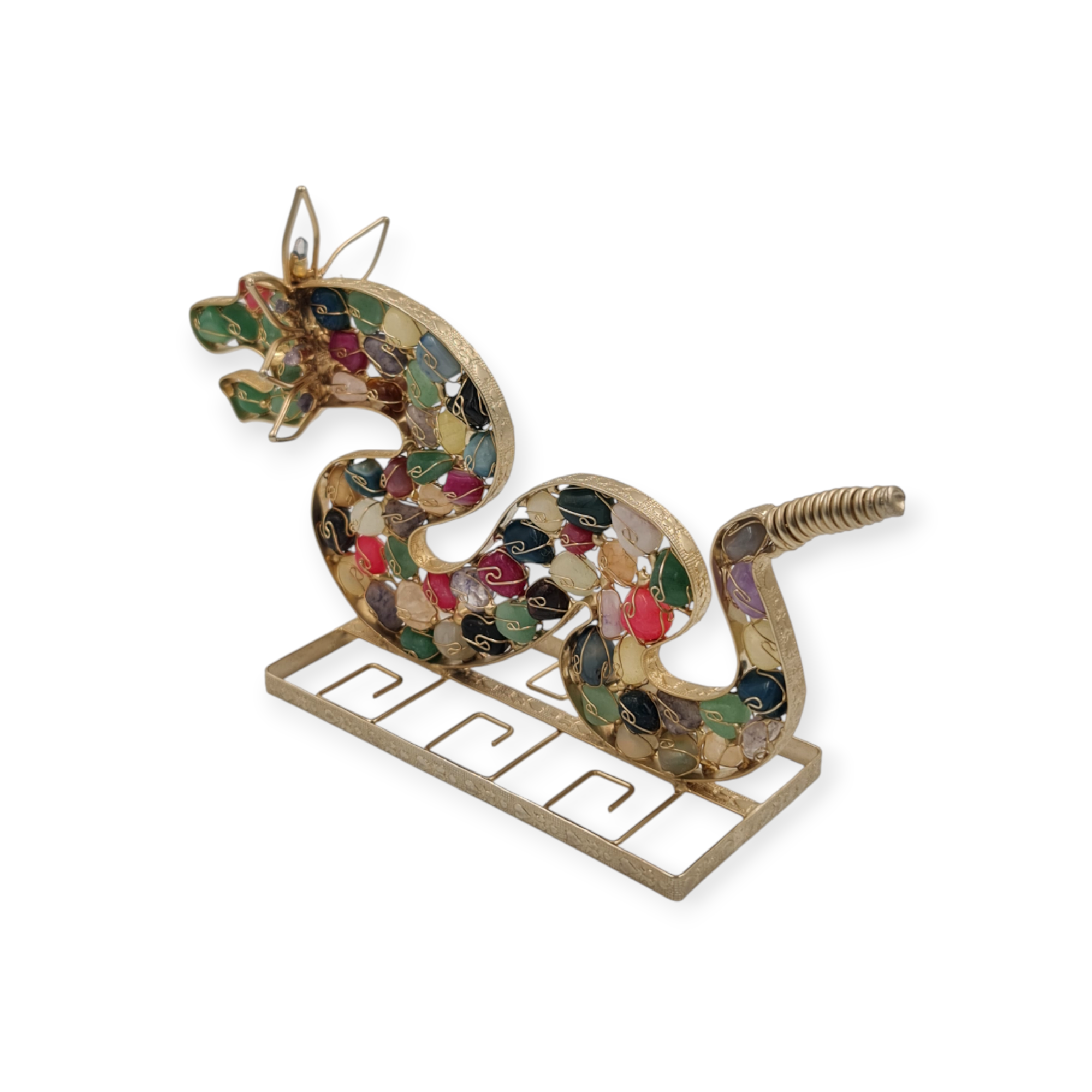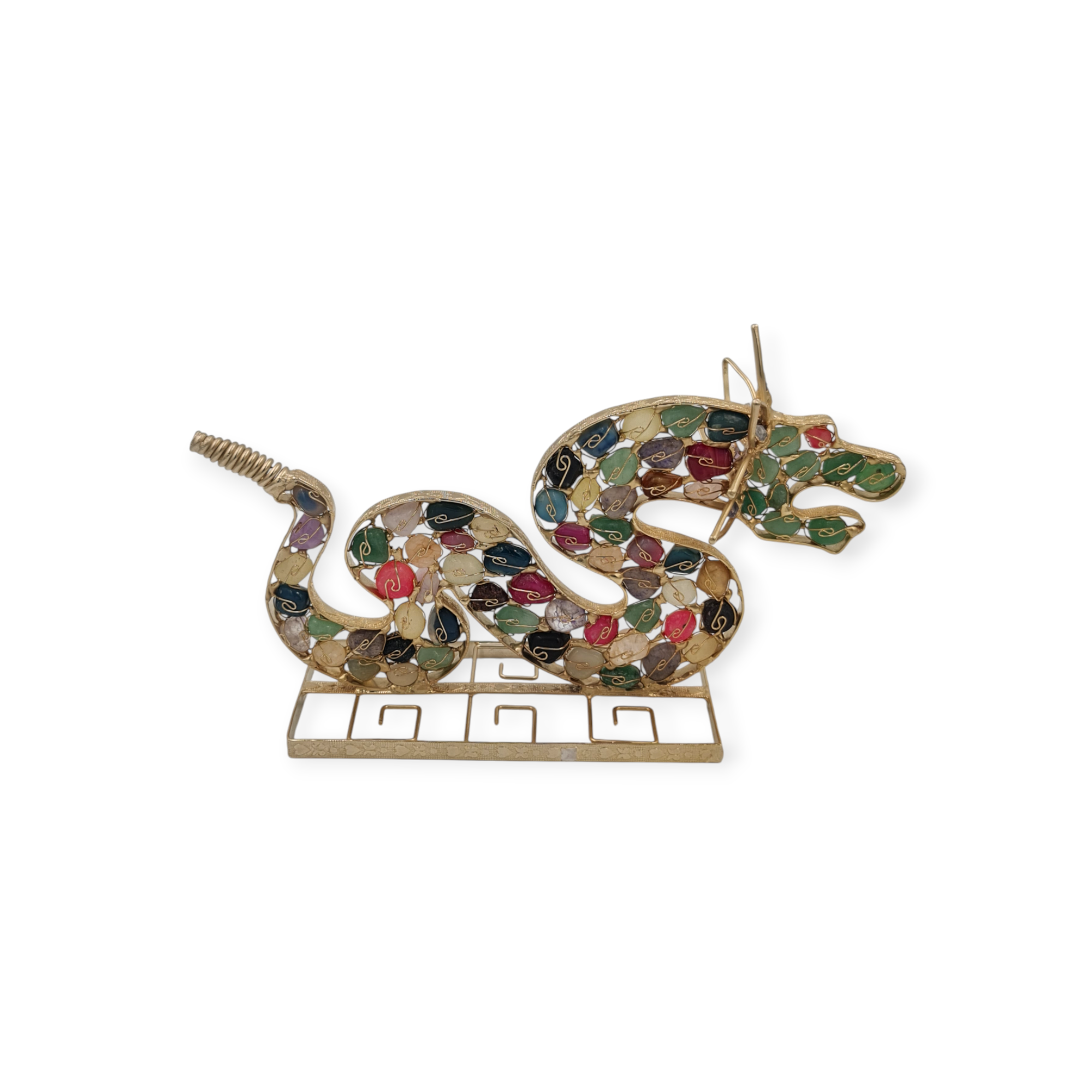 Esta pieza artesanal representa a Quetzalcóatl, la serpiente emplumada, una de las deidades más importantes de la cosmovisión mesoamericana. La figura está engarzada con diferentes tipos de cuarzo natural y montada sobre una base metálica, integrando simbolismo ancestral y trabajo artesanal en una sola pieza.