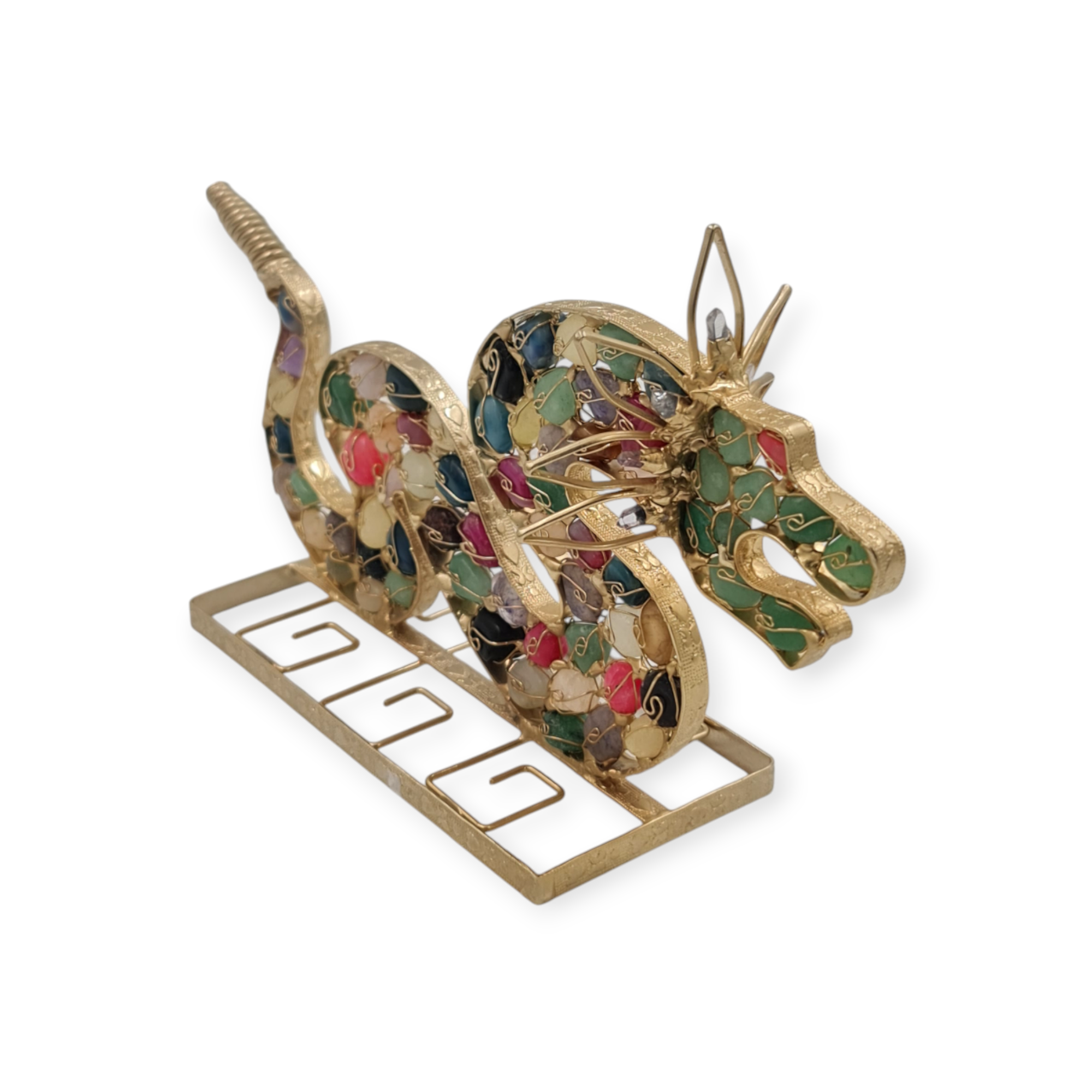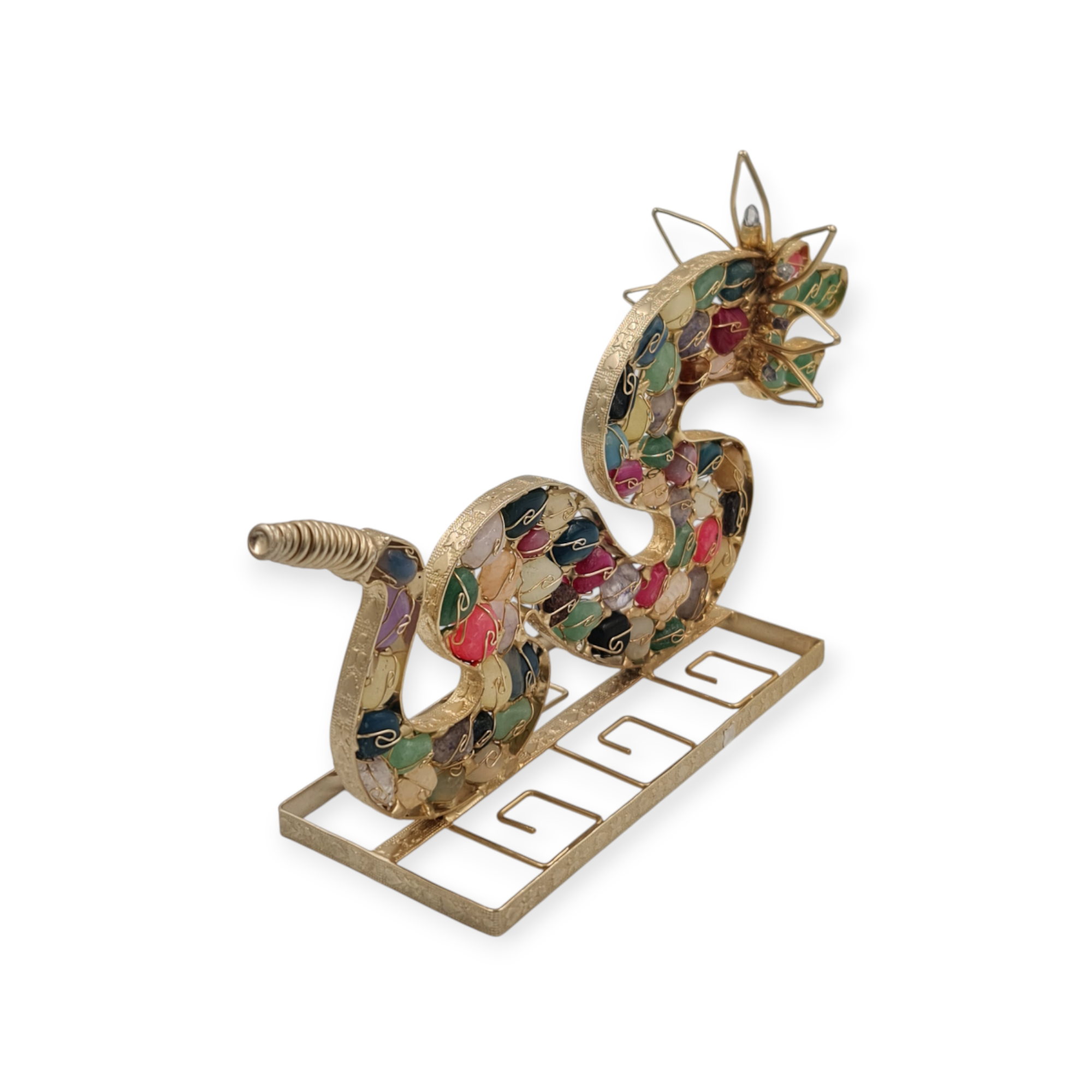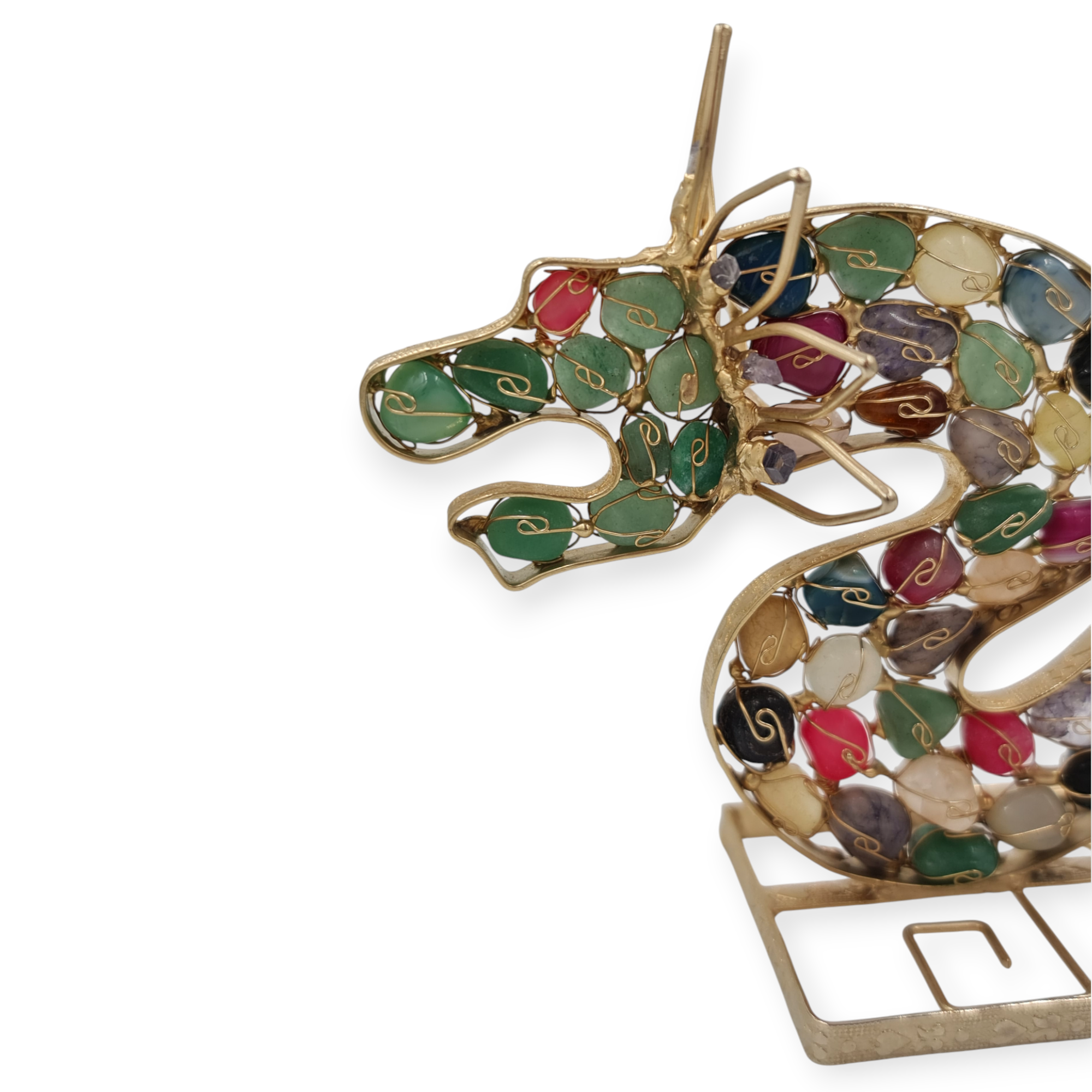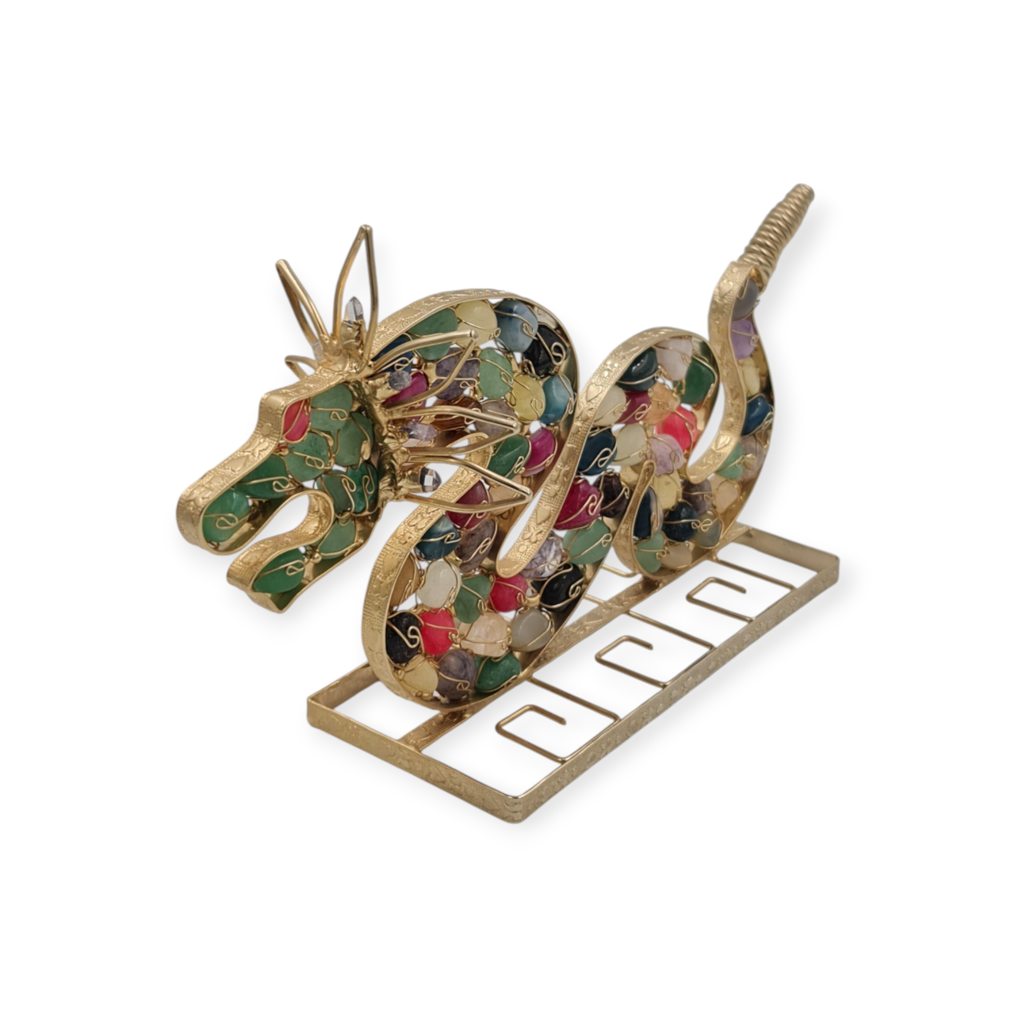 Esta pieza artesanal representa a Quetzalcóatl, la serpiente emplumada, una de las deidades más importantes de la cosmovisión mesoamericana. La figura está engarzada con diferentes tipos de cuarzo natural y montada sobre una base metálica, integrando simbolismo ancestral y trabajo artesanal en una sola pieza.