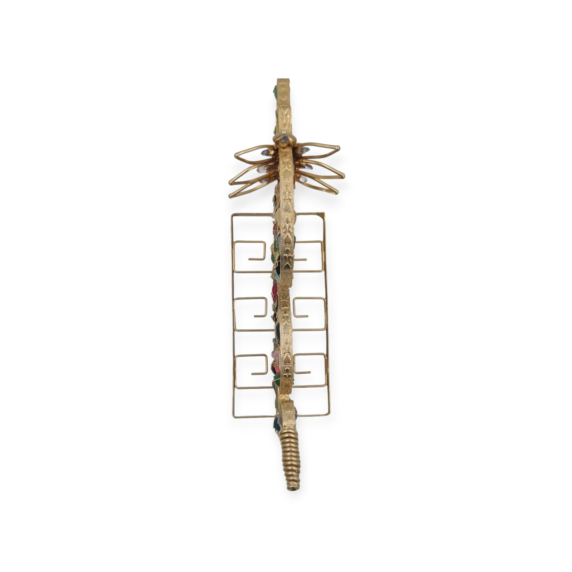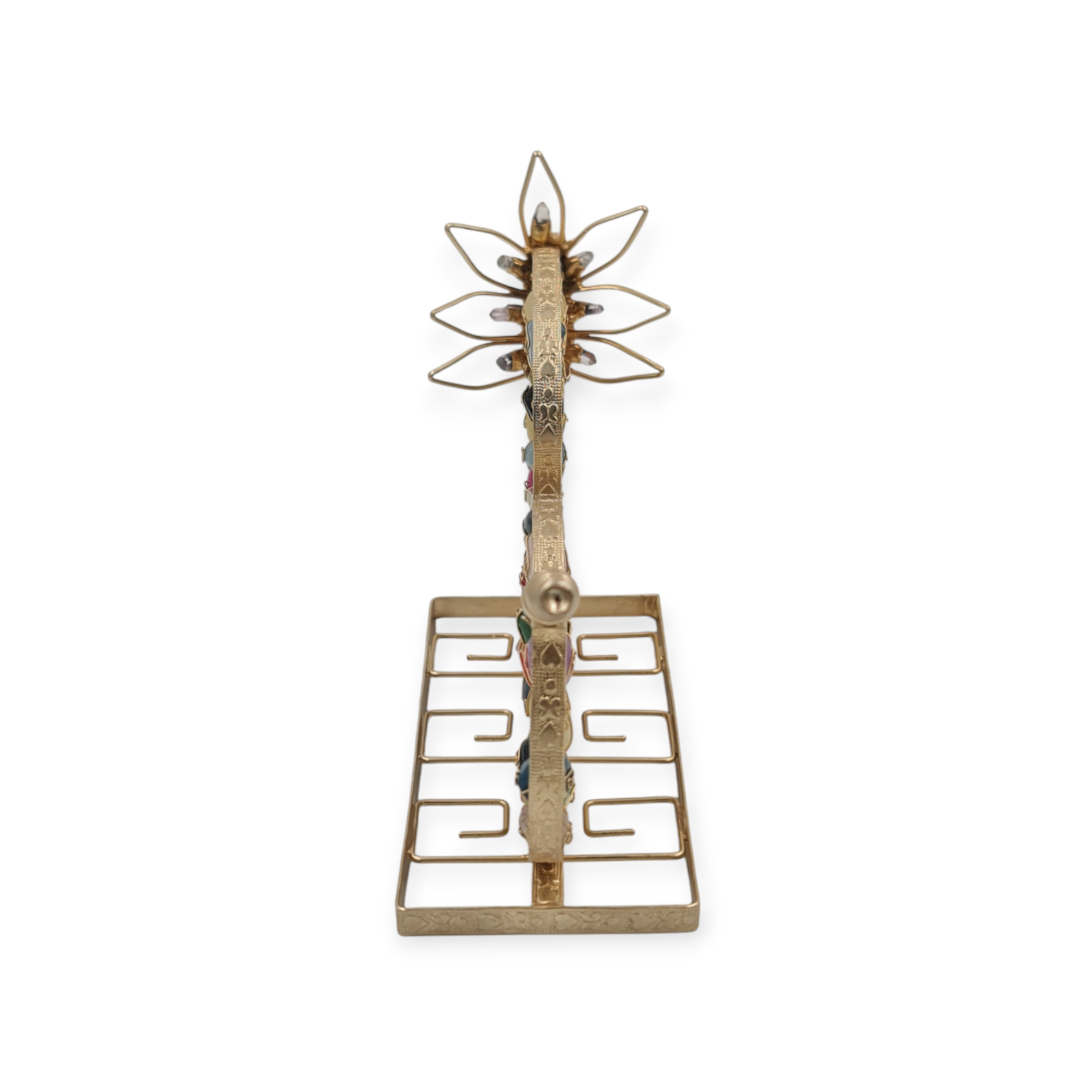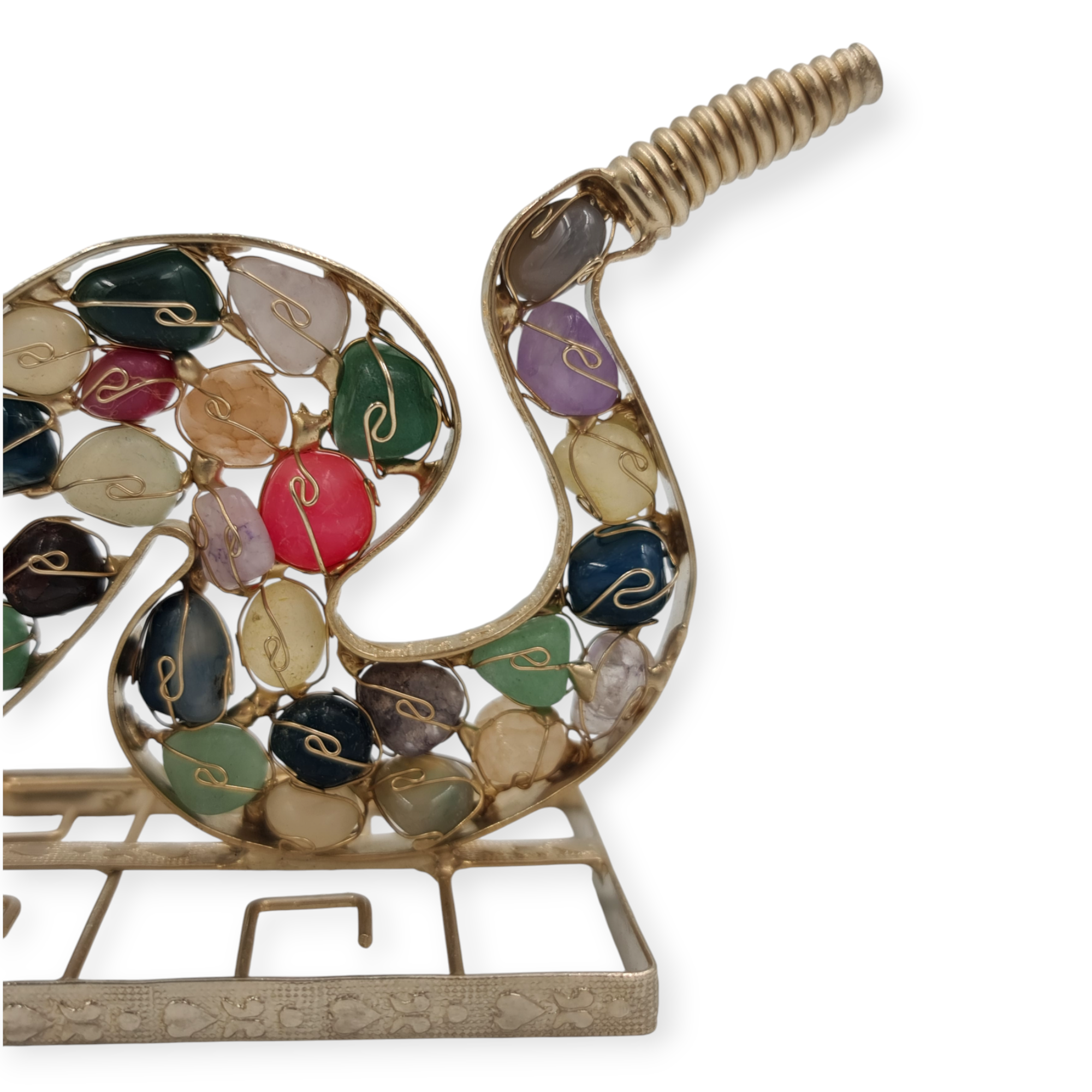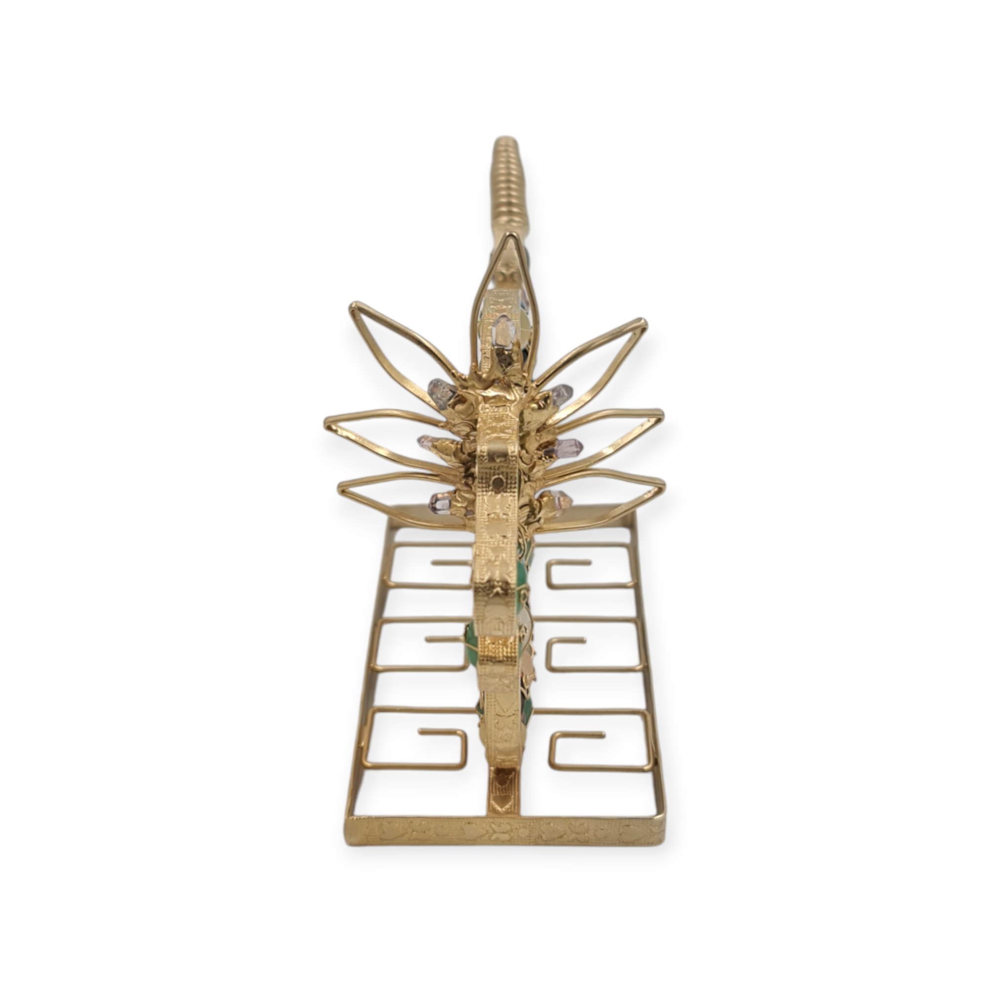 Esta pieza artesanal representa a Quetzalcóatl, la serpiente emplumada, una de las deidades más importantes de la cosmovisión mesoamericana. La figura está engarzada con diferentes tipos de cuarzo natural y montada sobre una base metálica, integrando simbolismo ancestral y trabajo artesanal en una sola pieza.