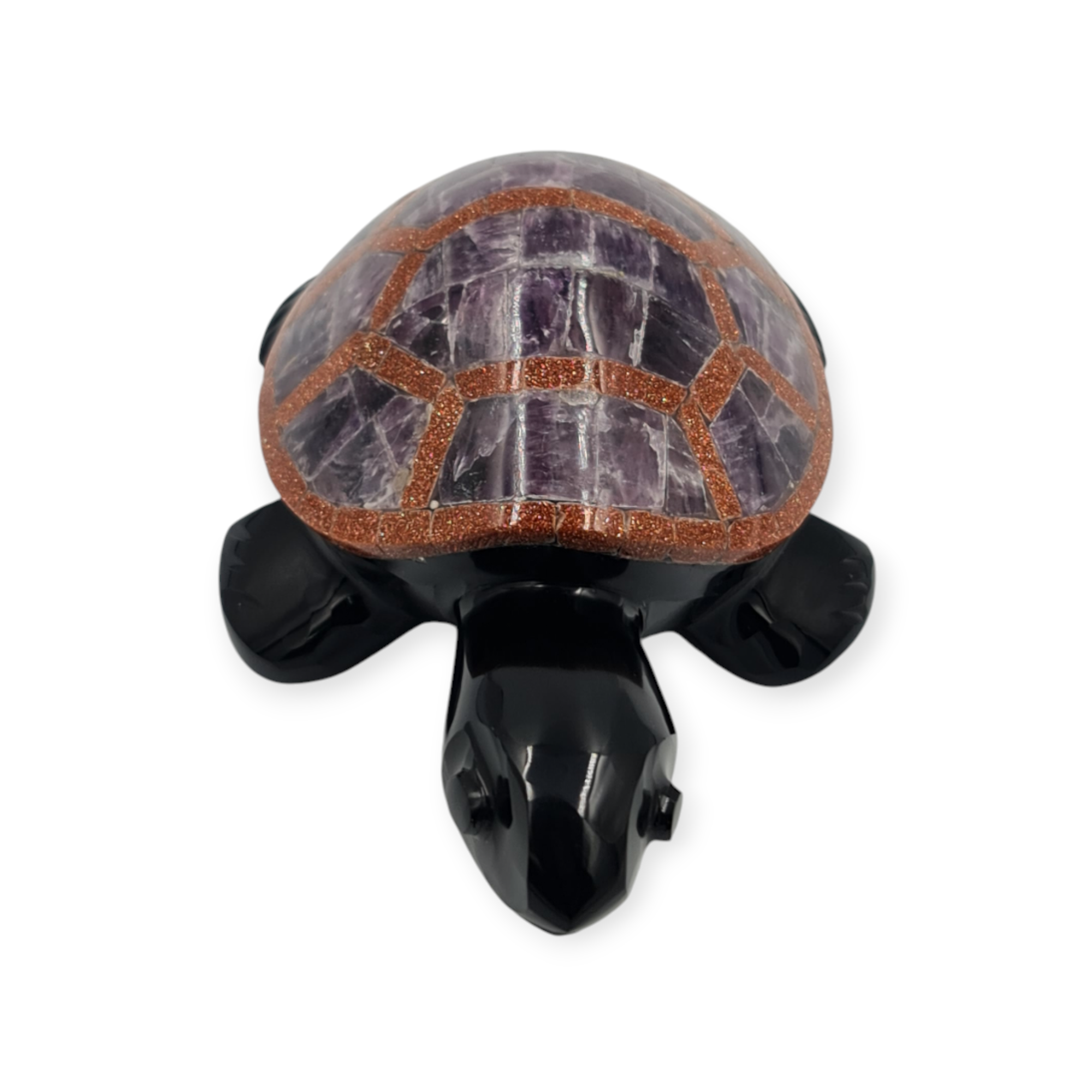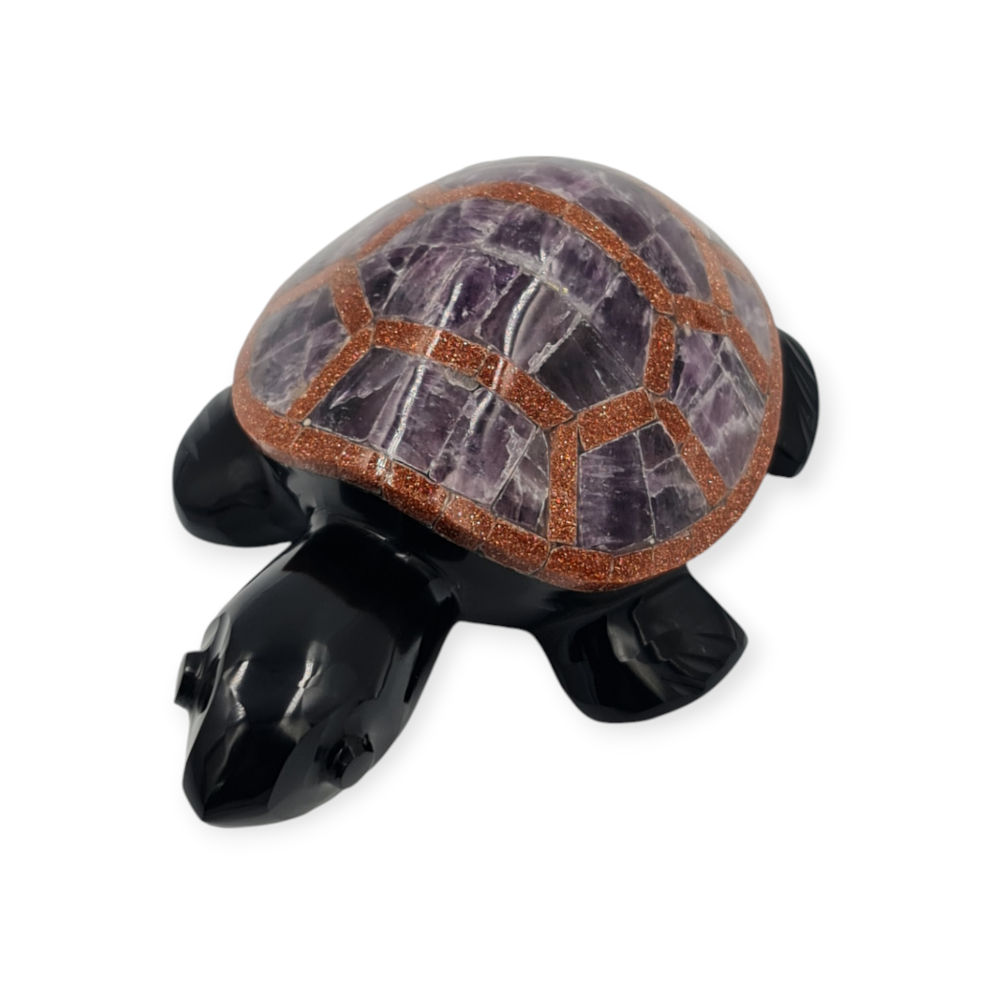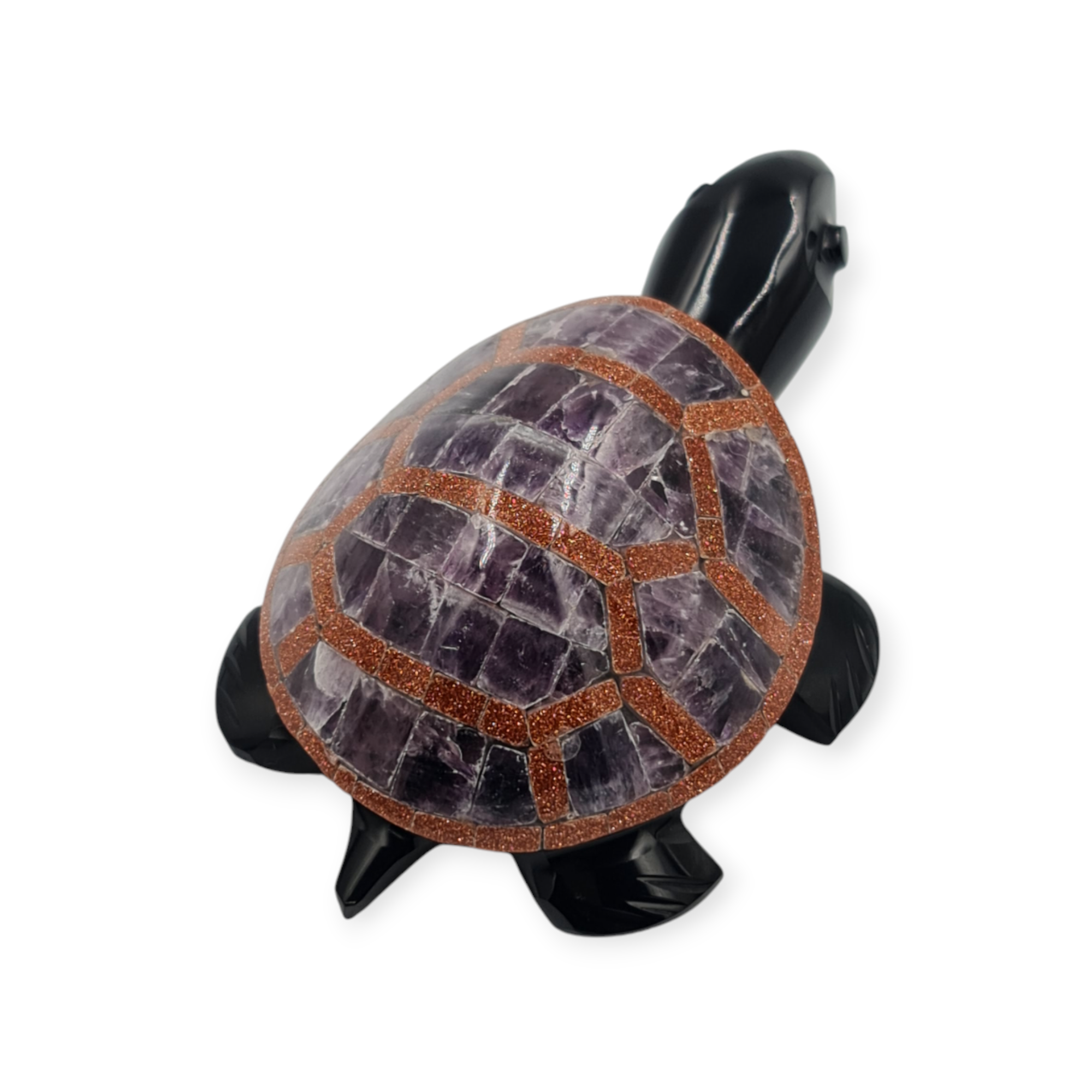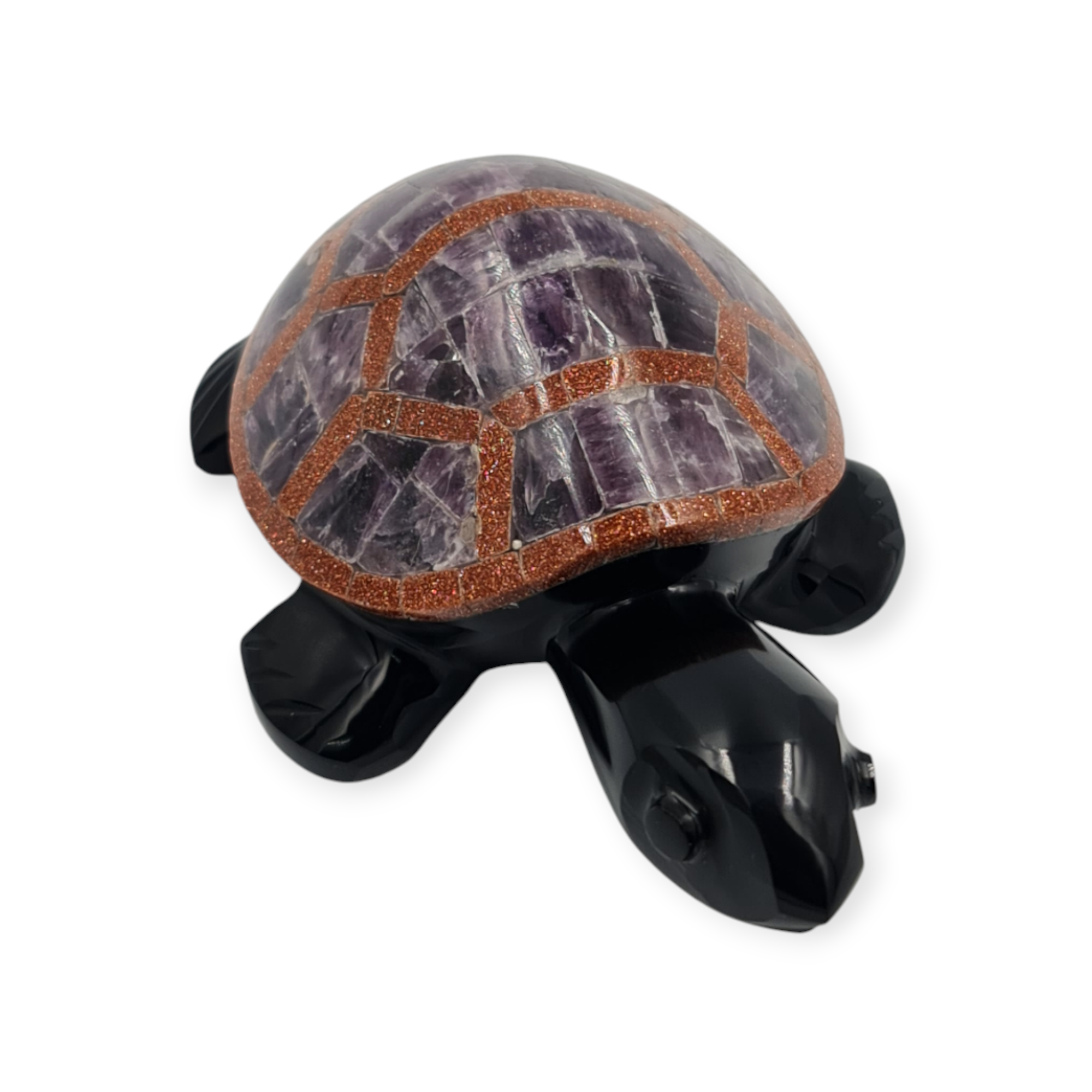 Esta tortuga de obsidiana negra es un amuleto ritual asociado a la protección, la estabilidad y la permanencia. Elaborada de manera artesanal e incrustada con diferentes piedras semipreciosas, esta pieza se trabaja como símbolo de resguardo y firmeza.