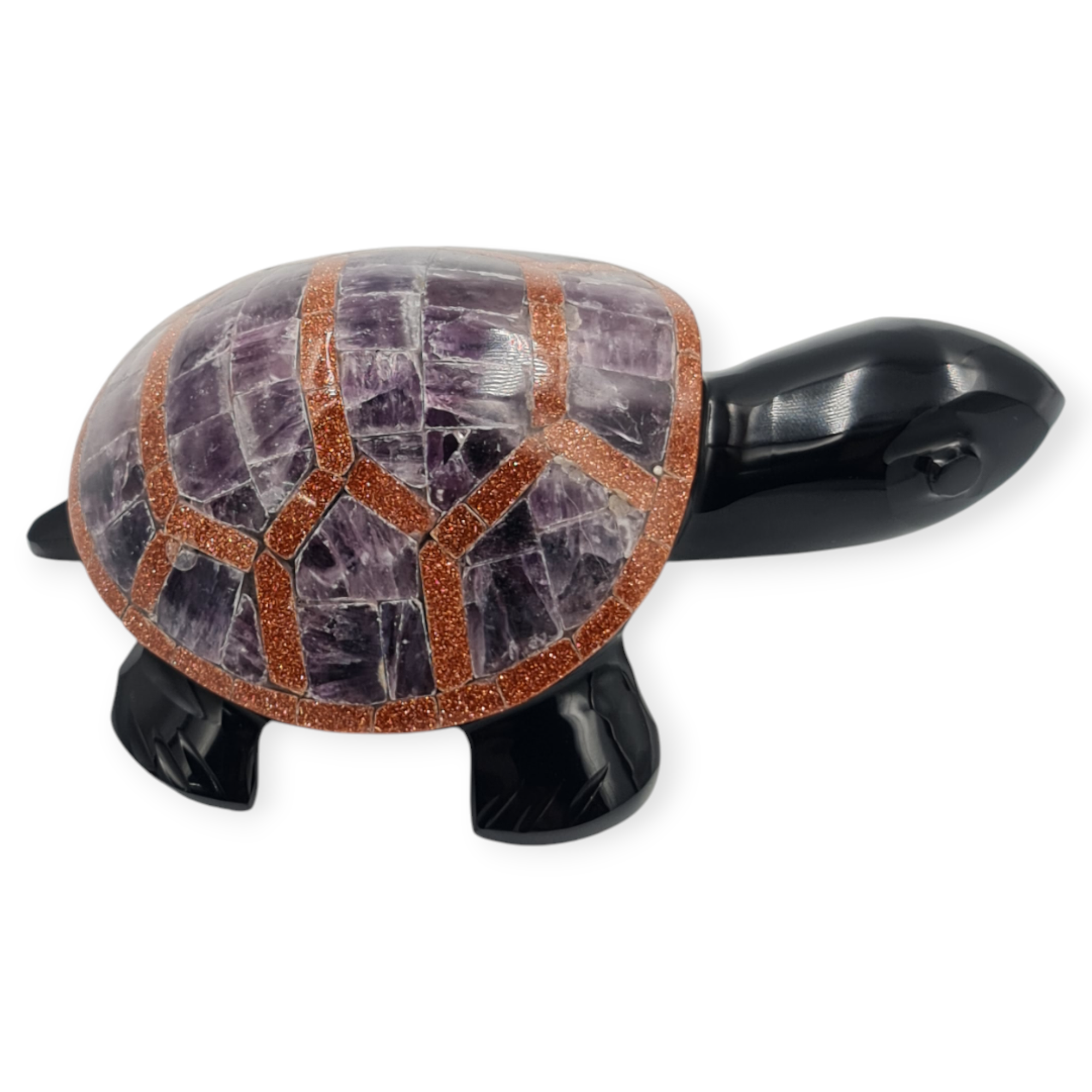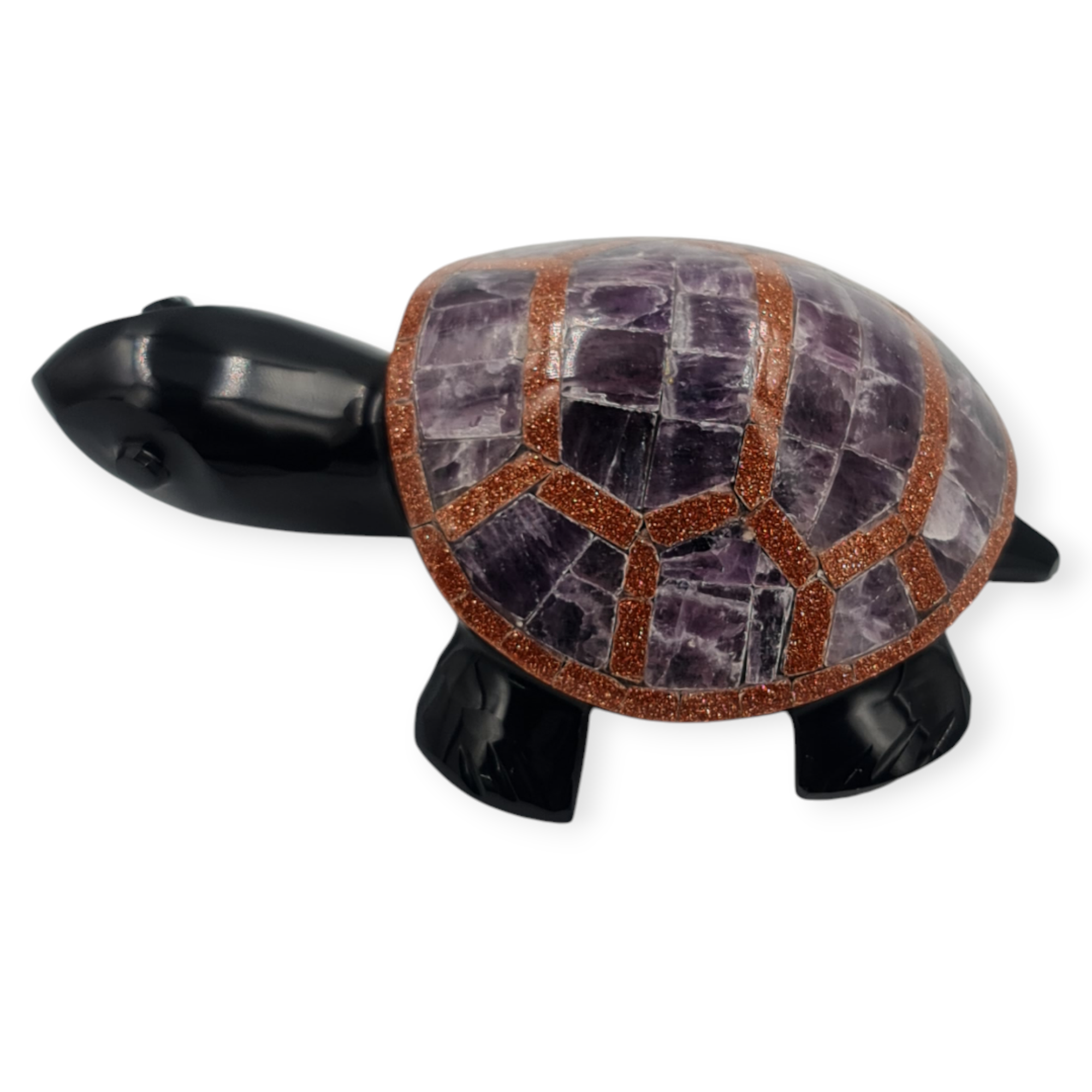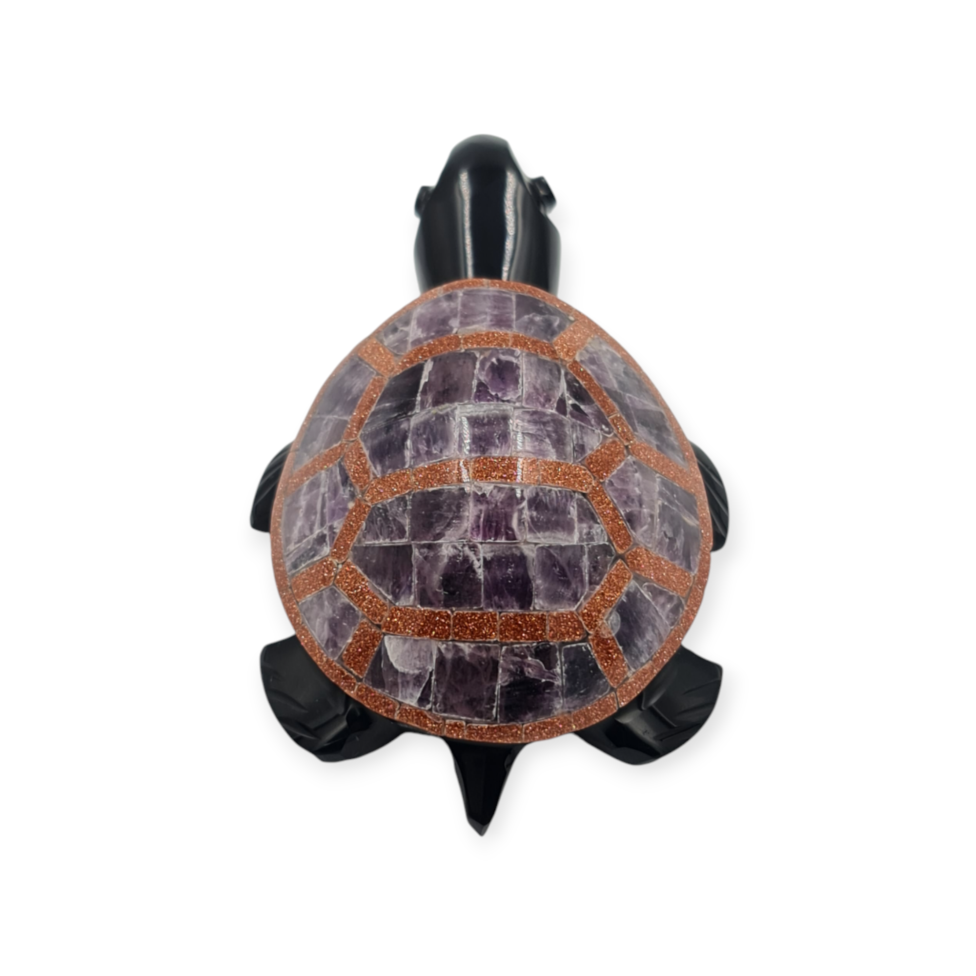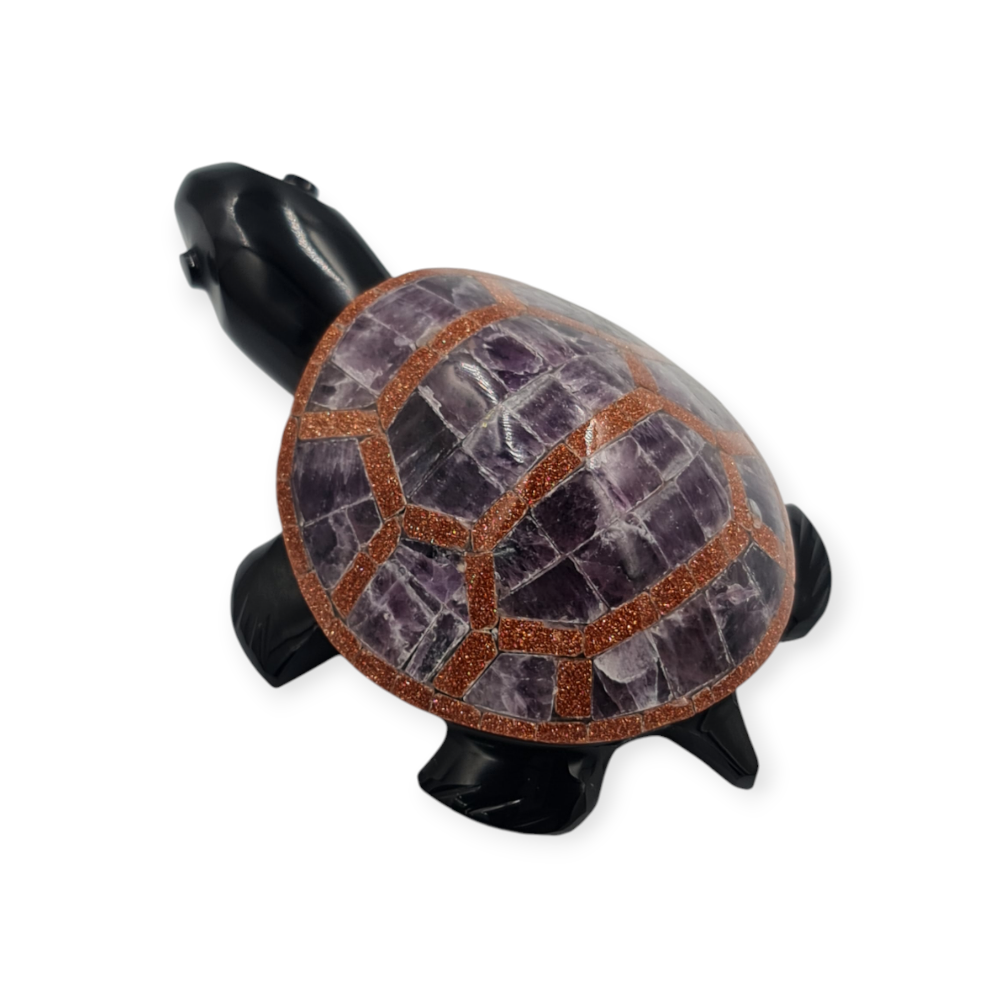 Esta tortuga de obsidiana negra es un amuleto ritual asociado a la protección, la estabilidad y la permanencia. Elaborada de manera artesanal e incrustada con diferentes piedras semipreciosas, esta pieza se trabaja como símbolo de resguardo y firmeza.